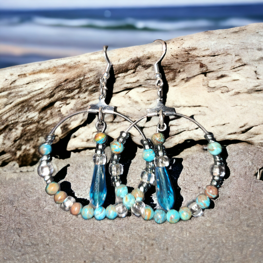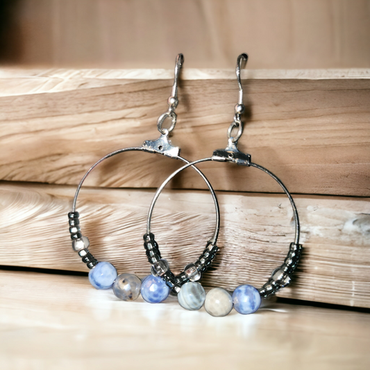 Blue Stone with glass and crystal beads hoop earrings