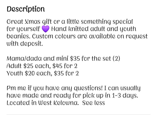 Handmade knitted toques Youth $20 each, $35 for 2